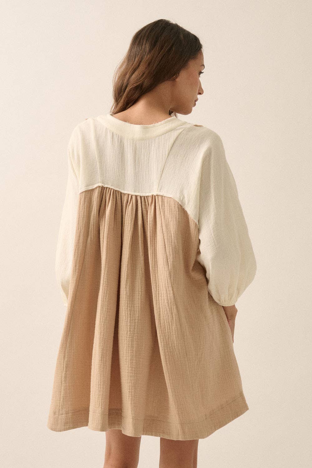A color block crinkle cotton mini dress with the following features: Collarless V neckline. Button-front closure with coconut wood buttons. Chevron bodice with gathered detail and contrast trim. 3/4-length raglan bubble sleeves with elastic cuffs. Side seam pockets. Exposed seams with raw-edge finish. Thigh length. Babydoll silhouette. Oversized fit.
