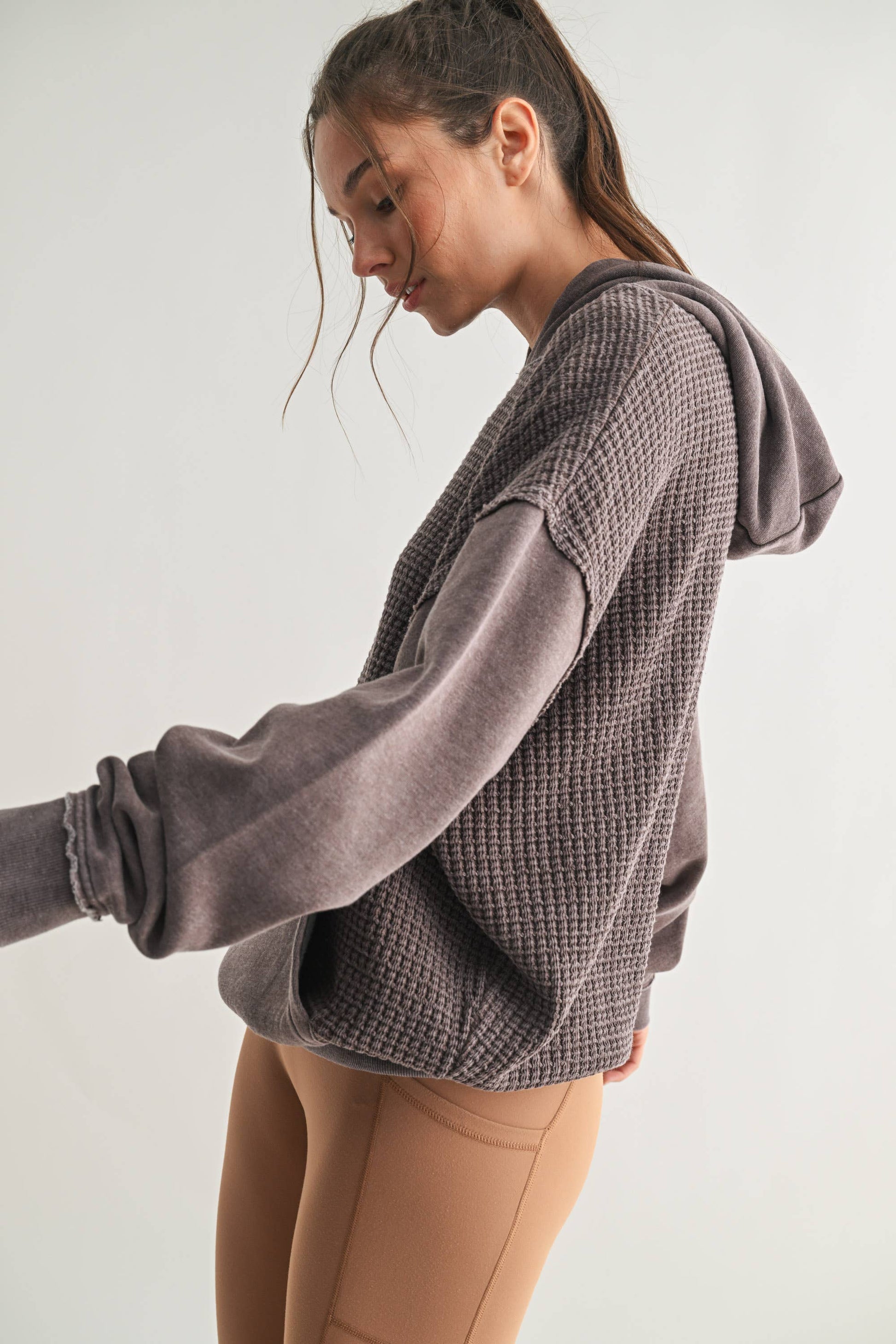 Textured, relaxed, and effortlessly cool. Crafted from a cozy cotton blend waffle knit, this pullover features contrast sleeves, hood, and kangaroo pocket for a colorblocked look that feels fresh and modern. The dropped sleeves and relaxed fit make it perfect for layering on laid-back days or post-workout wind-downs.