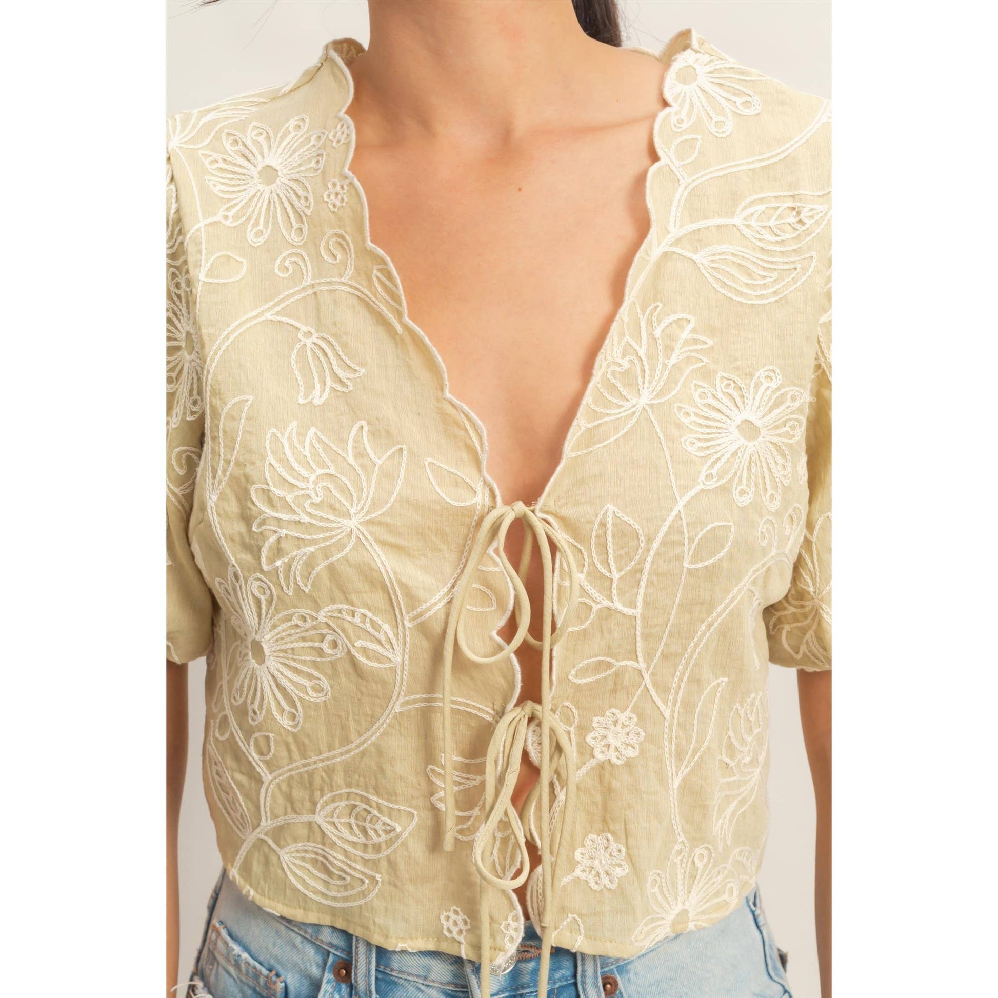 A floral embroidered top featuring a scalloped neckline and puff sleeves. The tie-front adds a charming touch. Pair with high-waisted jeans for a chic ensemble.