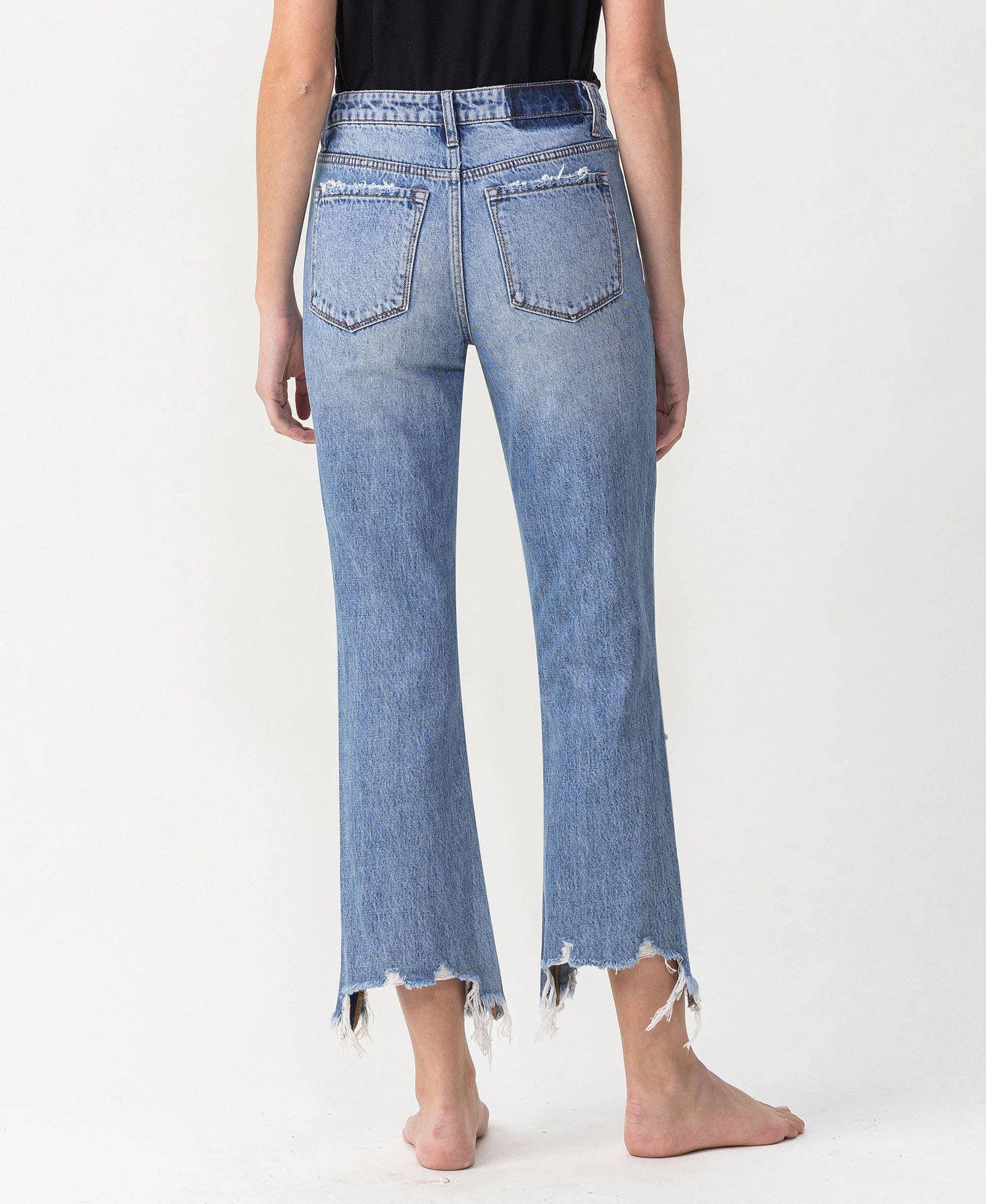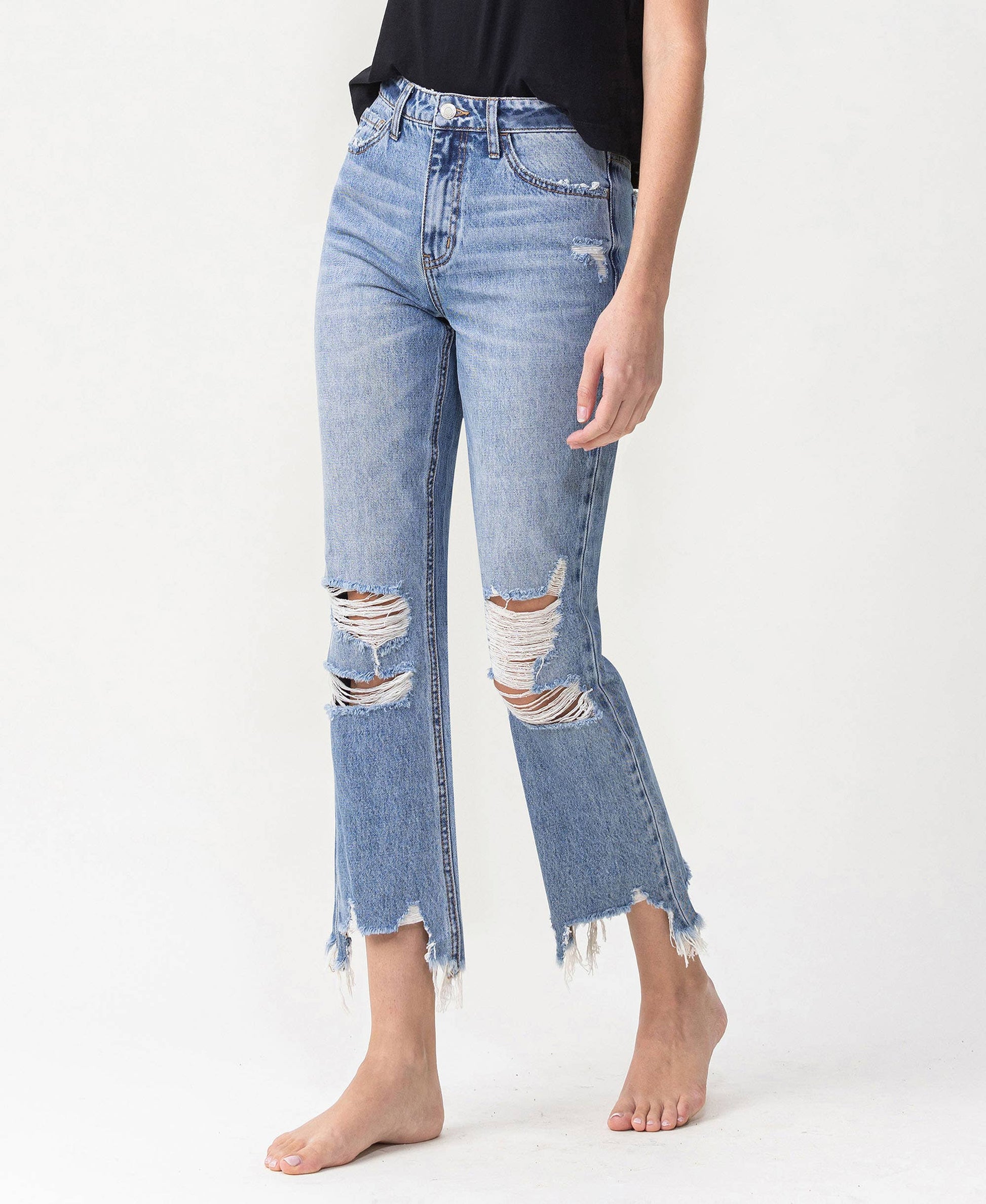 HIGH RISE RELAXED STRAIGHT JEANS NON STRETCH DENIM, HIGH RISE WAIST, DISTRESSED DETAIL, CROPPED LENGTH, RELAXED STRAIGHT JEANS