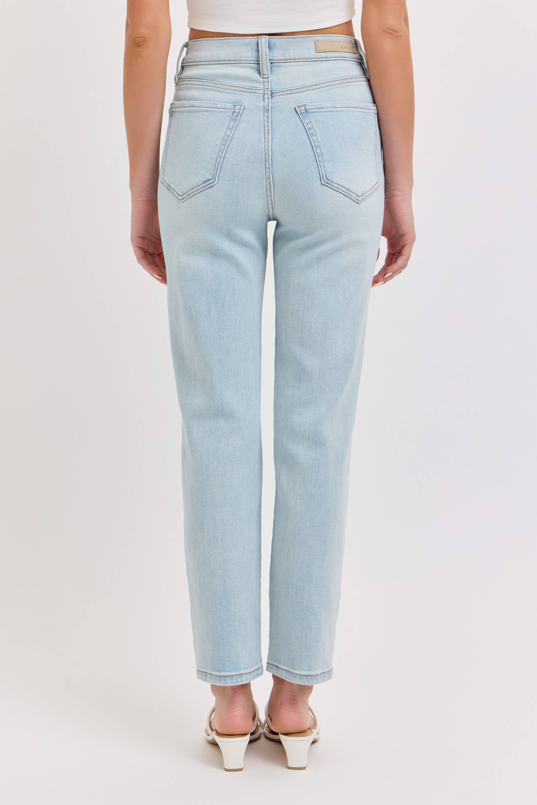 Introducing the High Rise Straight with Asymmetrical Back Pockets, the latest staple from Cello. This design boasts five pockets, distinctive frayed knee detailing, stretch and a light wash ideal for casual laid-back vibes.