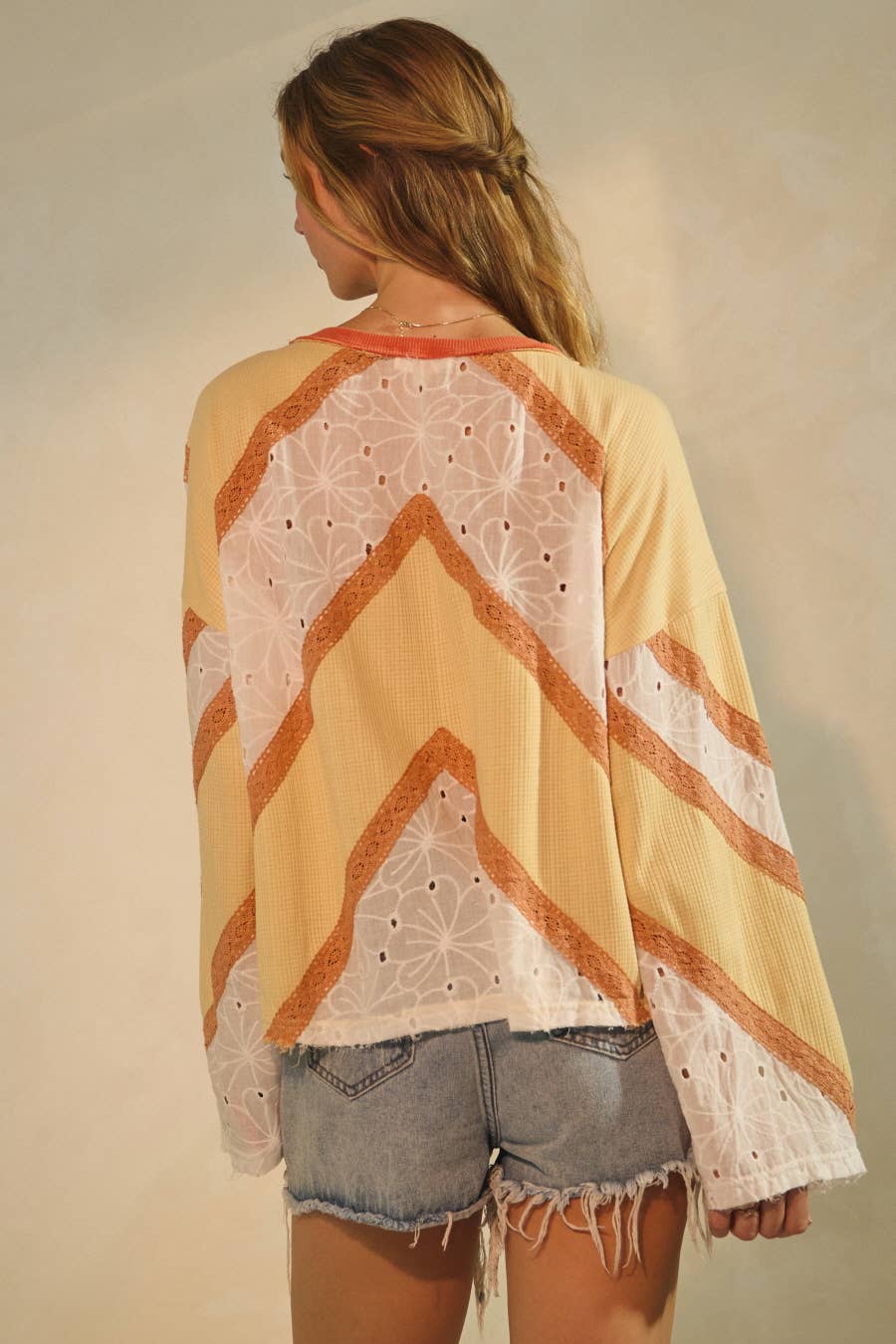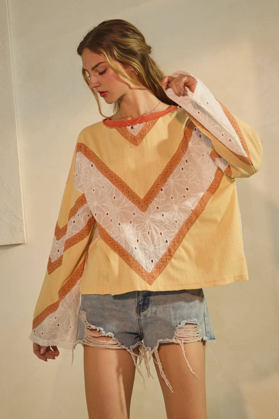 Loose-fit long-sleeve top featuring chevron lace panels and scalloped eyelet details.