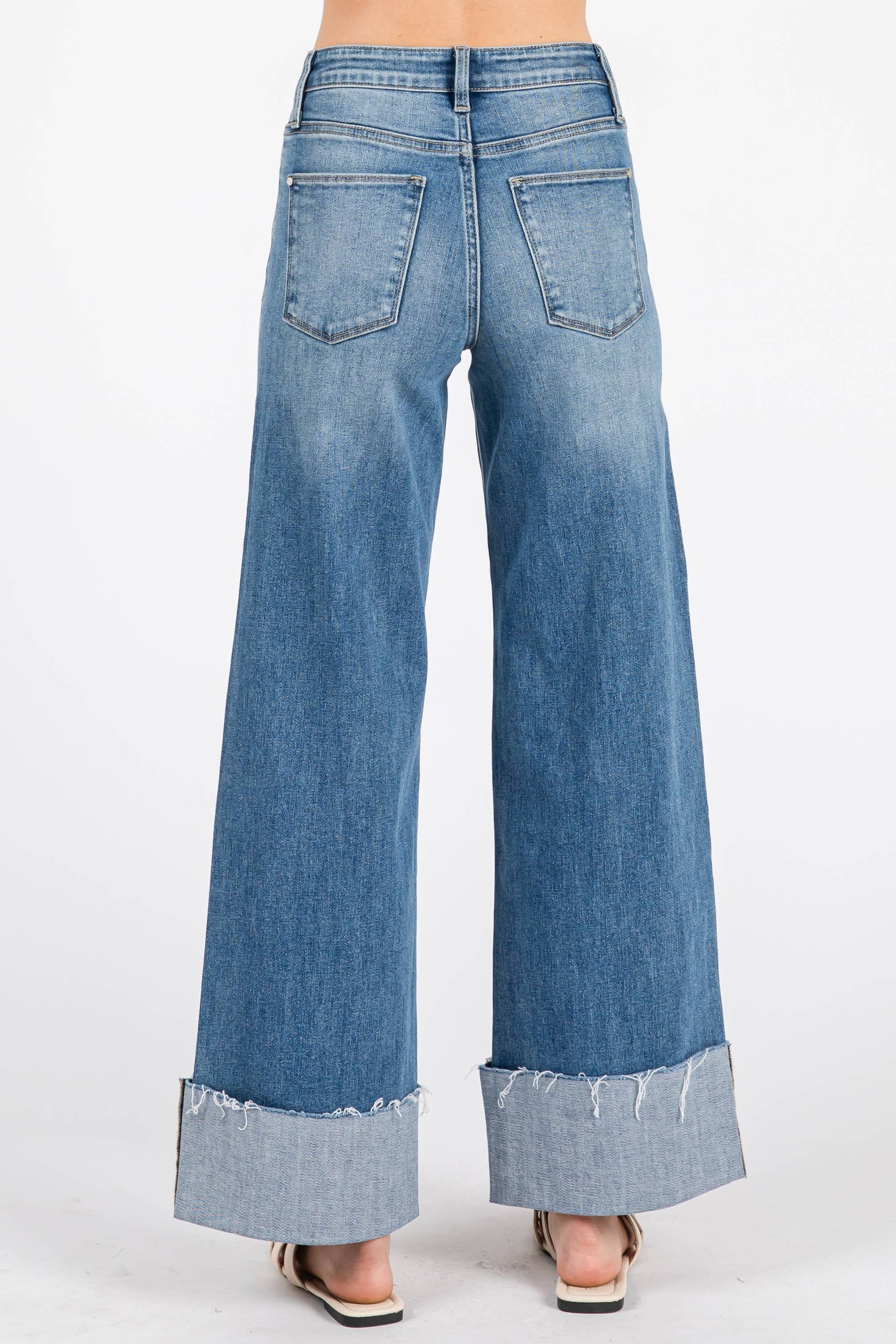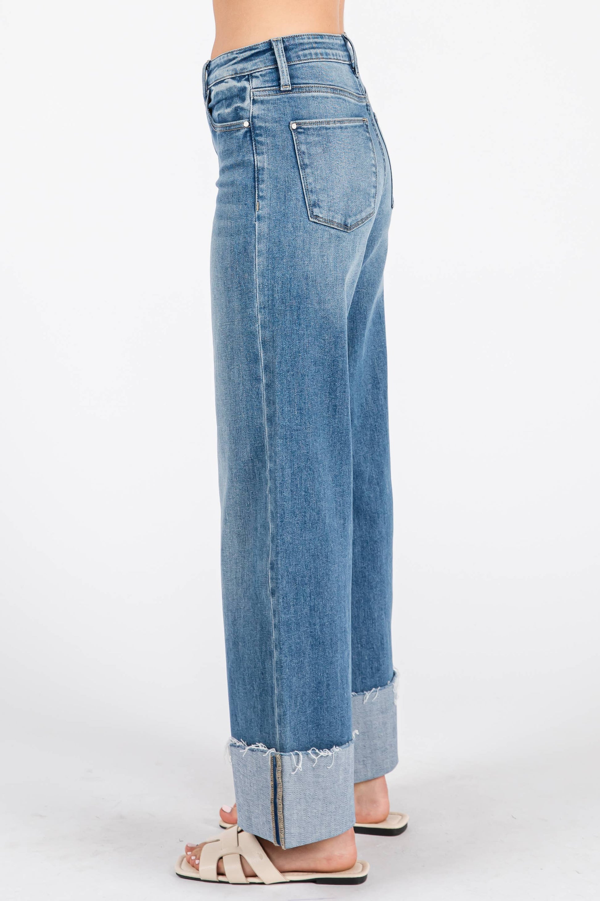 10.5" Rise, 30" Inseam after 4.5" single cuff, Modeled in size 3/25 - Leg opening : 22" - High-rise, cuffed wide leg jeans - 4.5" single cuffed with raw edge hem - Button closure and zip fly - 5-pocket styling - 92% Cotton, 6% Polyester, 2% Spandex